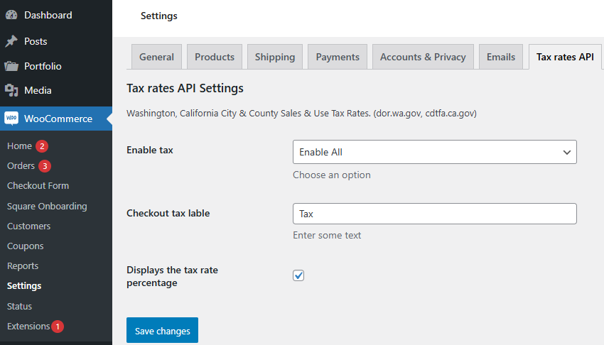 Connect WooCommerce with Washington and California State’s Department of Revenue API for on-the-fly sales tax rate lookup and calculation.